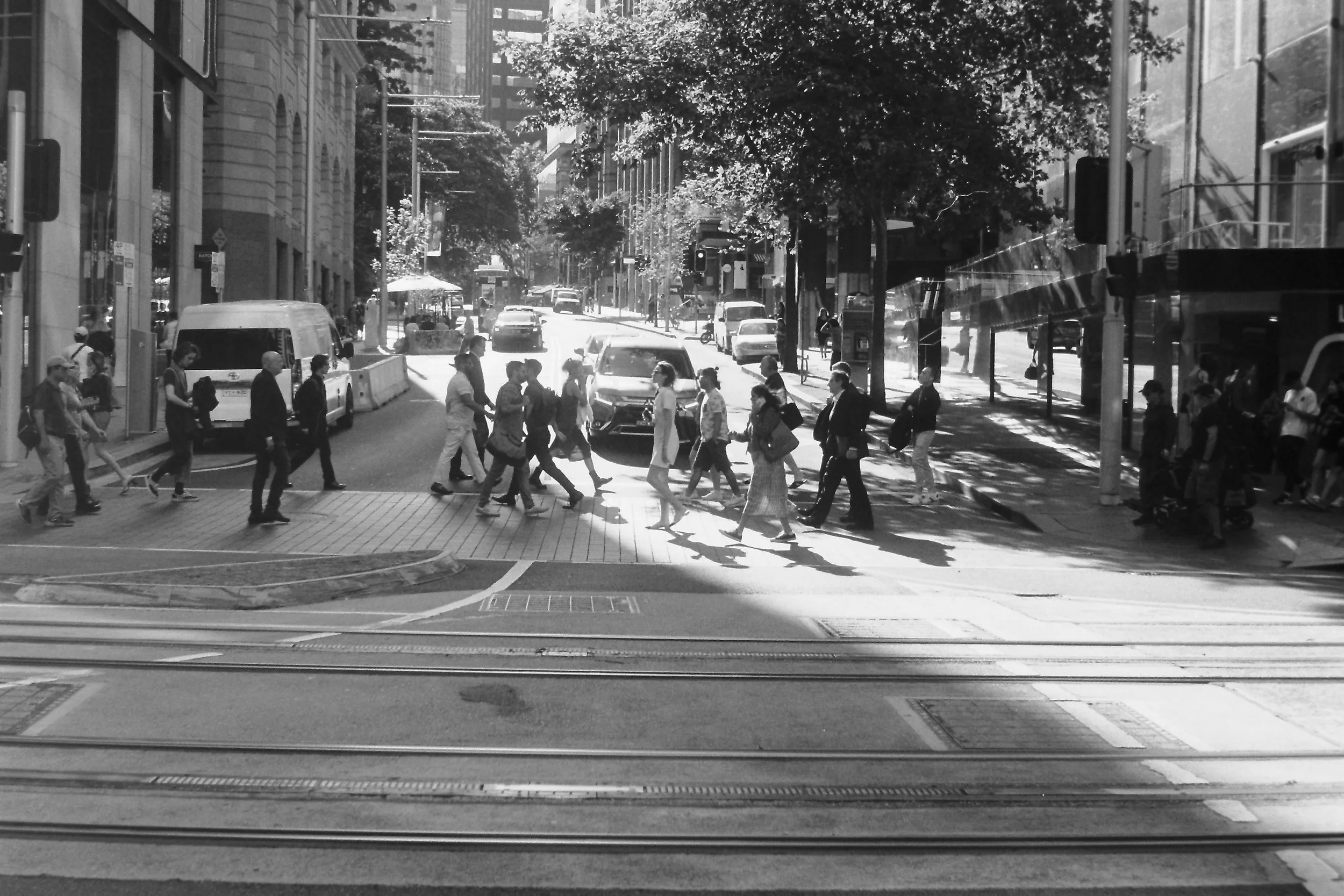 Shooting film in Sydney felt especially fitting. The strong contrasts, textured streets, and changing light created endless small scenes worth noticing. Without color, everything becomes about shape, shadow, and emotion. Black and white strips an image down to what really matters.